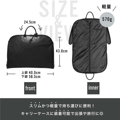 【サイズ】 幅 :(上部)40.0cm (下部)58.5cm 高さ:43cm マチ:6cm ハンドル:24.5cm 【重量】 570g 【開口部】 ファスナー 【外ポケット】前面オープンポケット×1 【内ポケット】ベルトストラップ×2 ■素材・成分:ナイロン・PU レザー デザイン 洗練されたシンプルなガーメントバッグキャリーケースに装着可能で手持ちから空港、駅構内の移動にと様々なビジネスシーンにフィット。